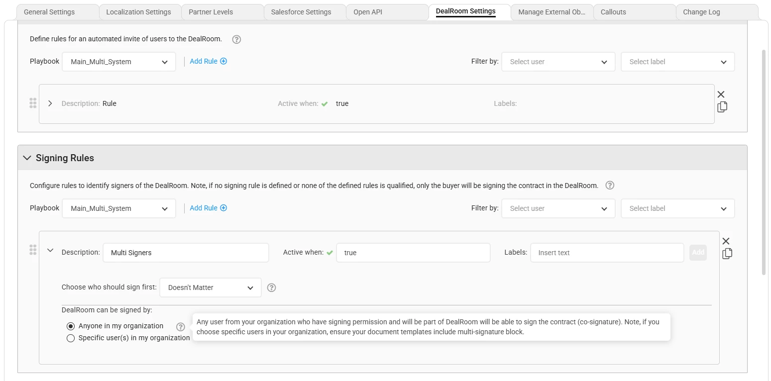 We have some signing rules in the system and there are multiple signers assigned to each rule. Is there system setting like one signature is ok or require signatures from all signers? ( Like the setting we have for rule based approvals require one or all). If not in this case would the system move deal to won if only 1 signer signs? Just trying to understand the behavior and the impact of multi-signers.