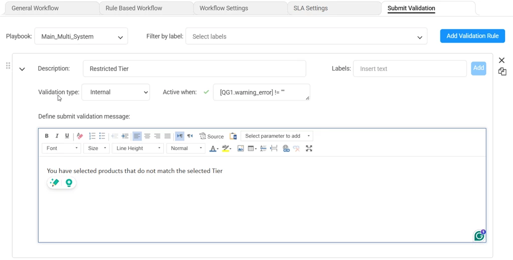 the rule:Â IncludesANY([QG1.Non_selected_Tier],[repeatable.Tier]) OR !IncludesANY([repeatable.Tier],[QG1.Tier_Selection]) AND [QG1.number_or_rows_in_selection_table] > 0 - Add a validation rule: