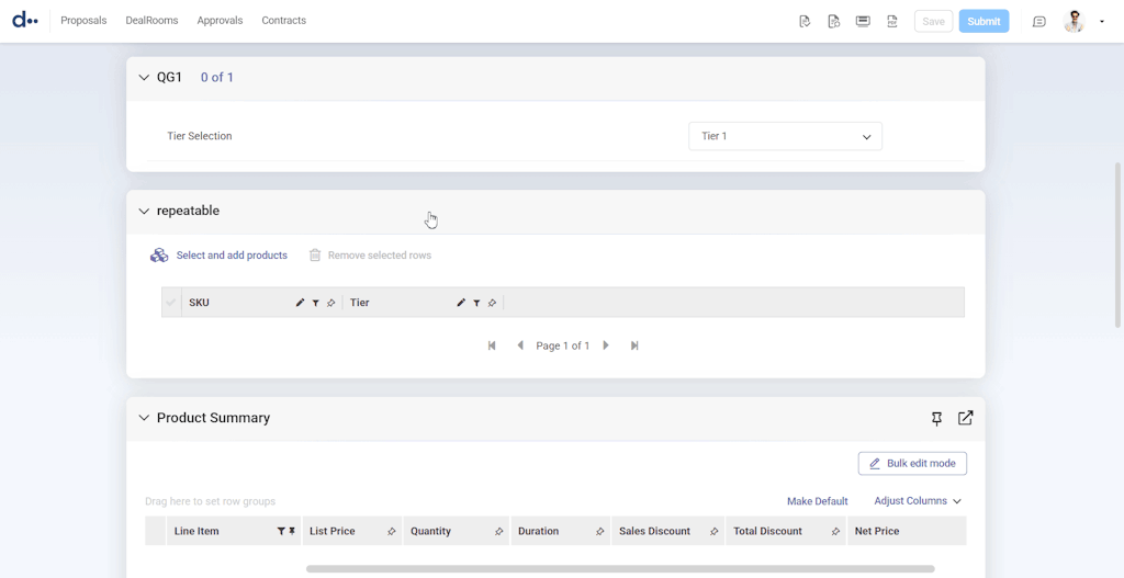- Configured Product Selection question group, with âSelect and Addâ button, filters enabled