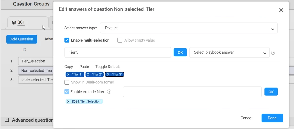 * set all values as default - Use Exclude filter, and choose the QG1.Tier_Selection question