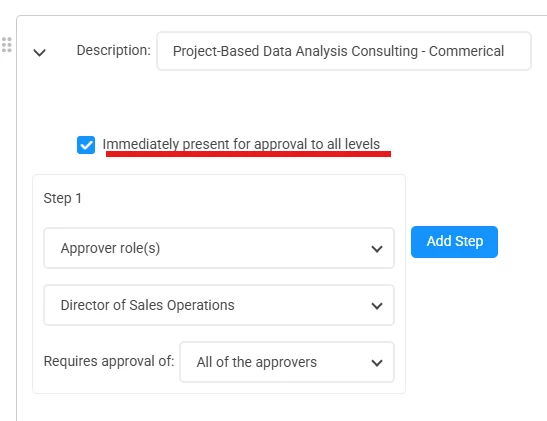 This is why, in the case of an approver who is part of multiple approval chains within the same quote, we only send out a single approval request rather than one for each individual approval. We send it when it’s his turn in the quickest chain he belongs to,