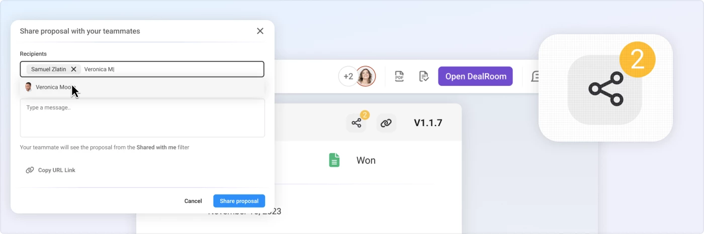 The new indictor allows you to see in a glance how many teammates a proposal was shared with. No need to open the share dialog. Just a quick look to track distribution.
